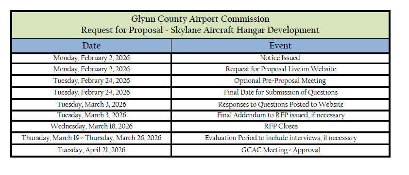 The Glynn County Airport Corporation (the “GCAC”) is requesting proposals from interested parties to sublease and develop hangar(s) at the St. Simons Island Airport, located on Skylane Road, St. Simons Island, Georgia.