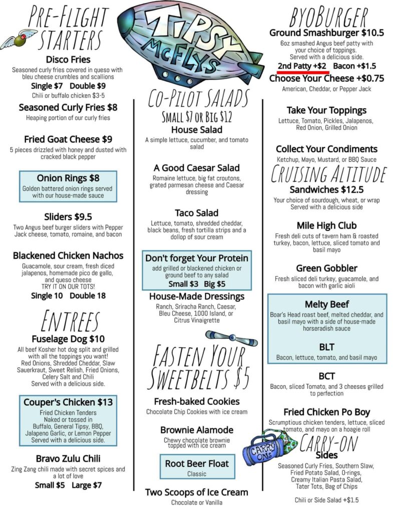 Grab a bite/ drink before security at Tipsy Mcfly’s!